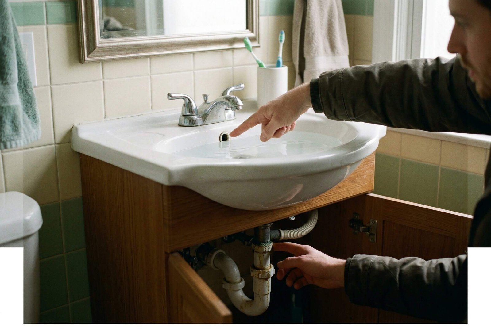 Although less common, plumbers may also check whether airflow or pressure issues inside the plumbing system are affecting how water flows through the overflow channel. Problems with vent pipes or shared drain lines can sometimes influence drainage behavior in the sink.
