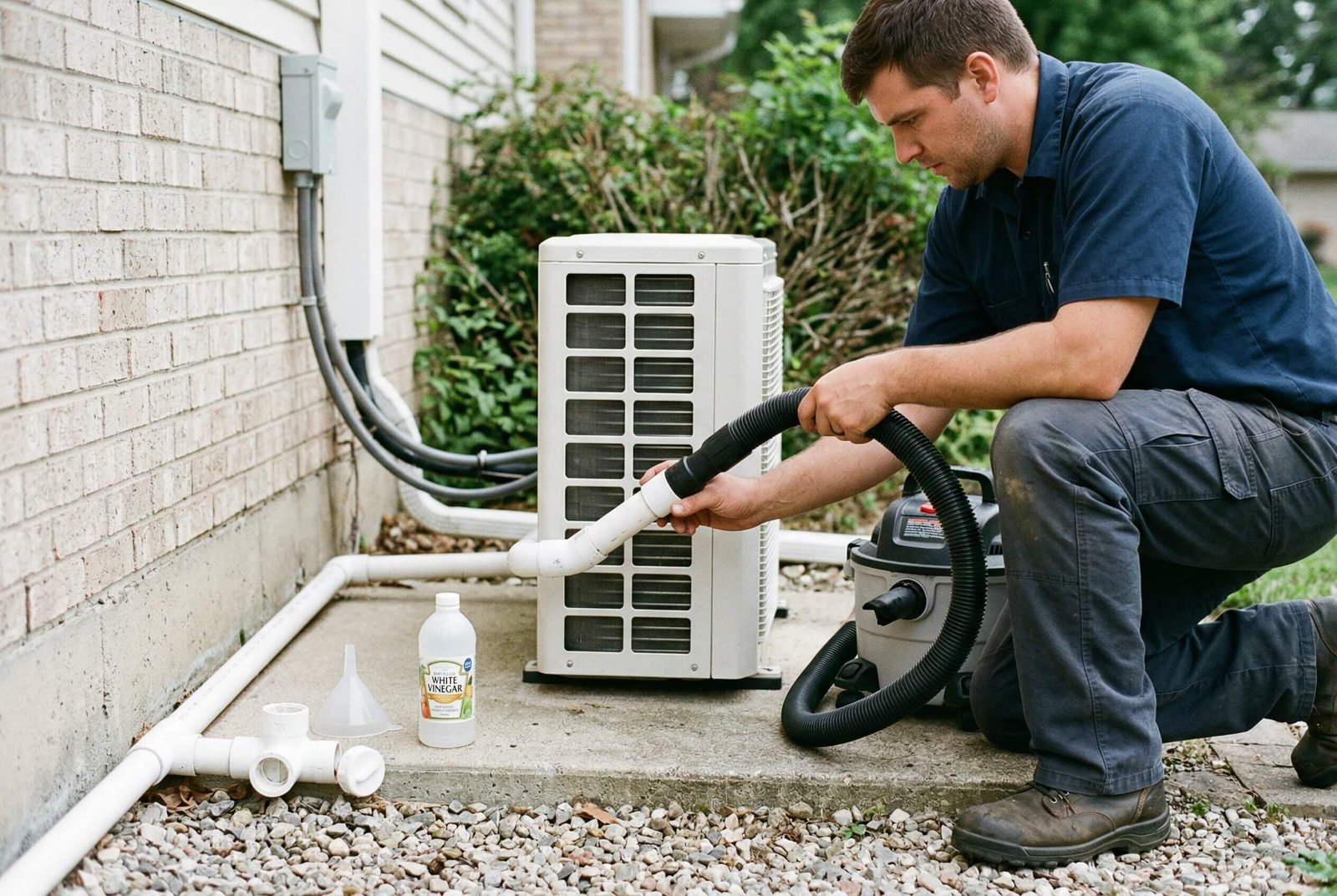 One of the most recommended HVAC maintenance techniques is flushing the condensate line with white vinegar. Vinegar helps break down algae, mold, and organic buildup that commonly forms inside AC drain lines.