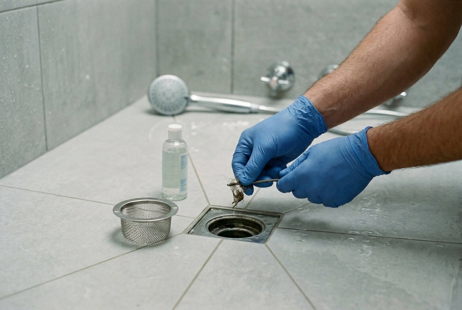 Start by removing the drain cover or stopper. In most showers, this is where the majority of hair gets trapped. You’ll often find a mix of hair, soap scum, and residue sitting just below the surface. Physically remove this material by hand or with a simple tool. This step alone prevents a large percentage of clogs from forming.