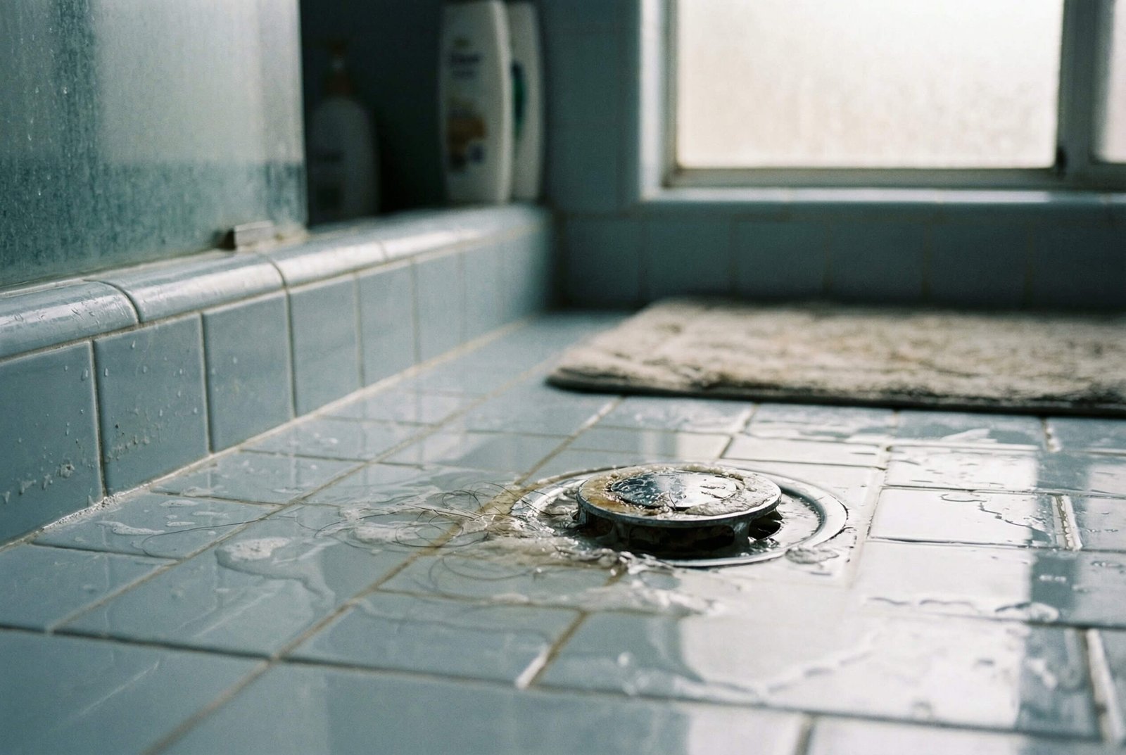 A shower drain may drain slowly without fully clogging when there is a partial obstruction inside the pipe. Hair, soap residue, and debris can collect along the pipe walls and gradually reduce the pipe’s diameter while still leaving some space for water to pass through.